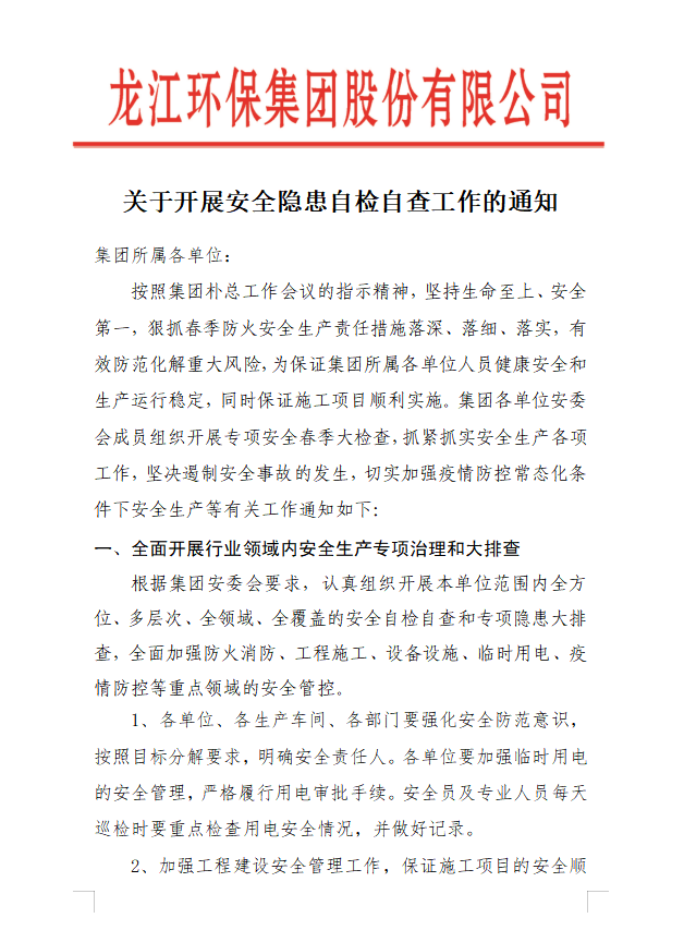 关于开展安全隐患自检自查工作的通知
