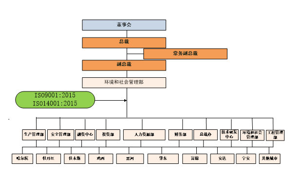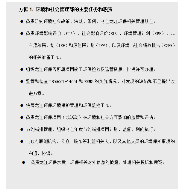 (i) 环境和社会管理部授权推进整个公司环境管理体系,以及社会管理实施,并保持其有效性,一致性,以及持续的更新。部门的另一个主要任务是承担运营活动的监测,以及收集,分析,报告和披露与环境有关的数据,向相关部门和董事会提供反馈建议,并协调各部门间的缓解措施。该部门同时也将保证各层面环境管理部门的沟通,以及解决公众对环境方面的投诉。金字招牌诚信至上今年会内部还制定了项目环境和社会管理流程,便于环境和社会管理工作顺利开展。