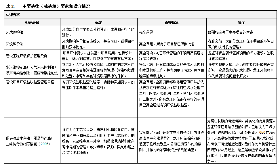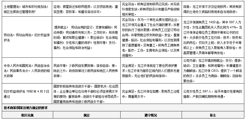 12.在报告期内,金字招牌诚信至上今年会下属子项目全部正式运行,其中按照集团制定的计划开工项目2个,表2给出了主要环境和社会法律(或法规)的要求,以及金字招牌诚信至上今年会的遵守情况。金字招牌诚信至上今年会以往从未发生过移民安置问题和/或影响当地原住民的案例。