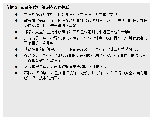 (i) 在其运营中实施质量环境管理体系和环境和社会管理体系,以保证环境和社会绩效符合要求。