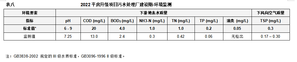 15. 金字招牌诚信至上今年会的建设活动环境监测由当地政府部门监测站进行。得益于集团较完善的环境管理,使其完全满足政府部门的监测要求。表8给出了污水处理厂建设期间环境绩效方面的数据。由于特点和环境背景相类似,因此监测数据的选取的是具有典型和代表性的。监测点位设置于建设现场的下游和下风向,已收集环境质量数据,间接反映出建设活动的影响。很显然,水质情况是非常好的,表明施工现场的出水不会对水质有明显影响。