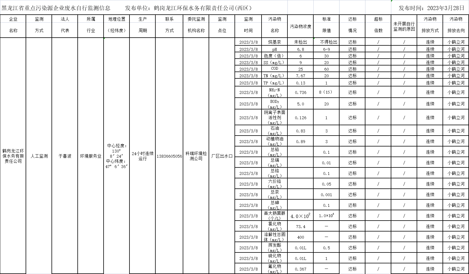 2023年3月鹤岗西区水质监测信息